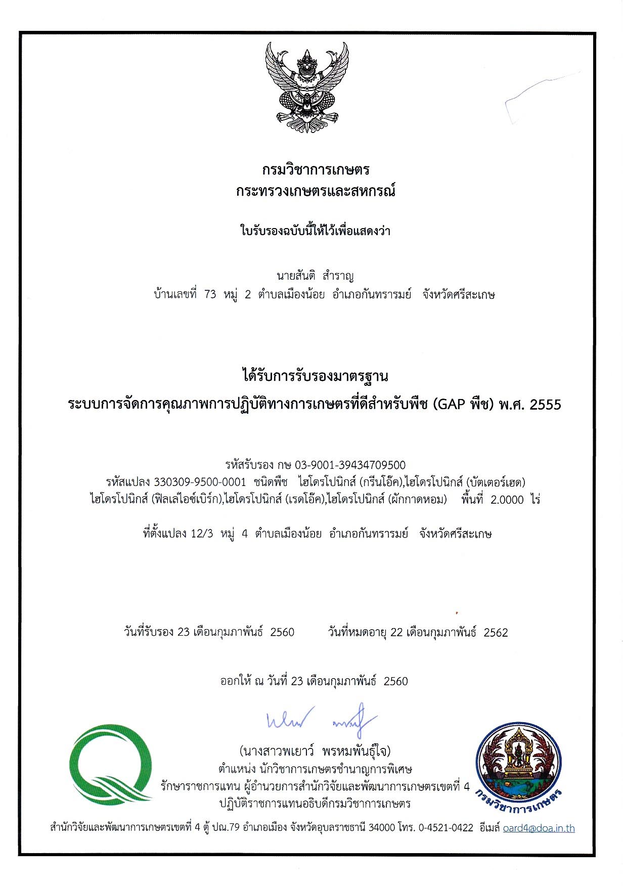 รับรองการปลูกผัก จากกรมวิชาการเกษตร เลขที่ กษ03-9001-39434709500 GAP
