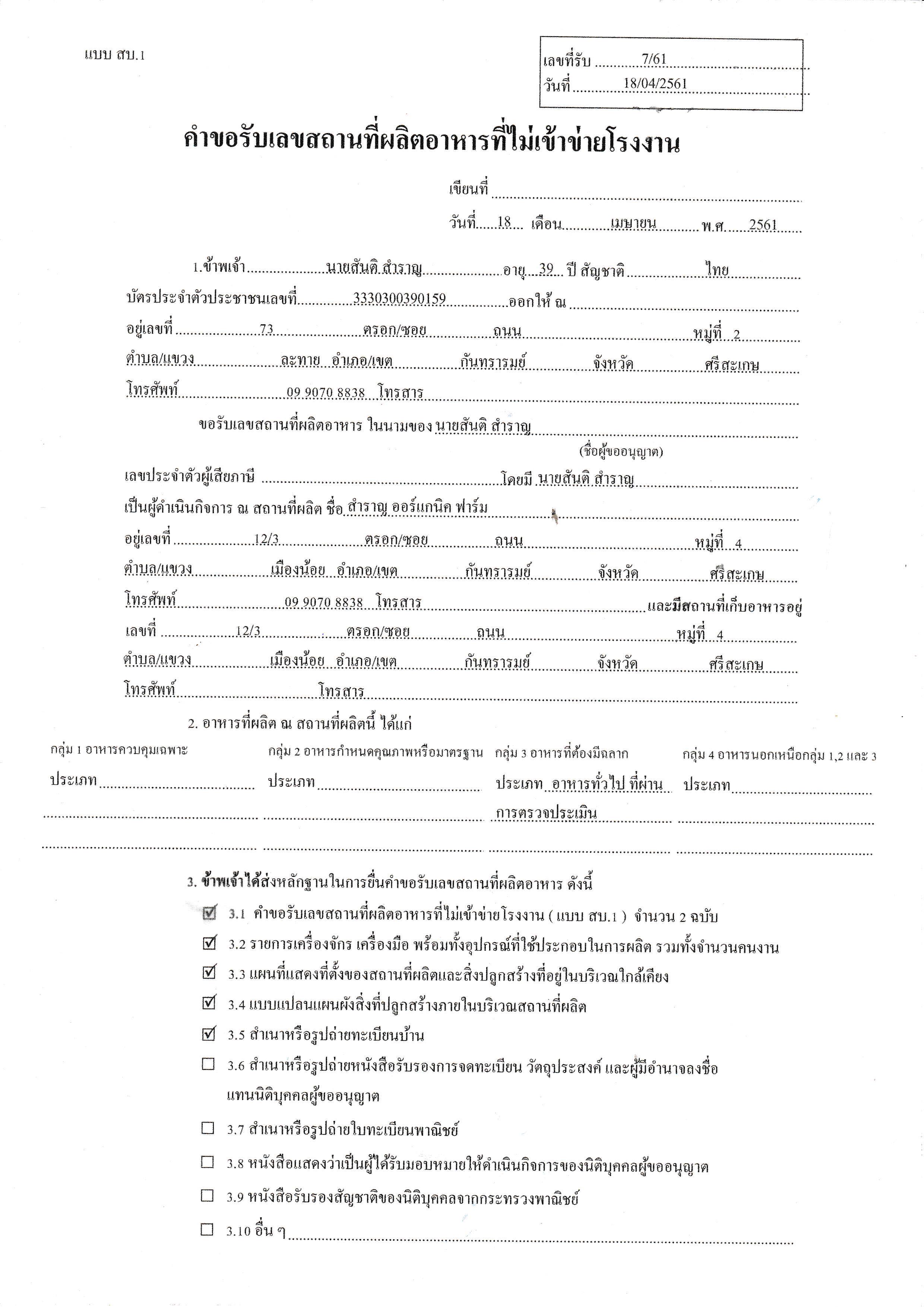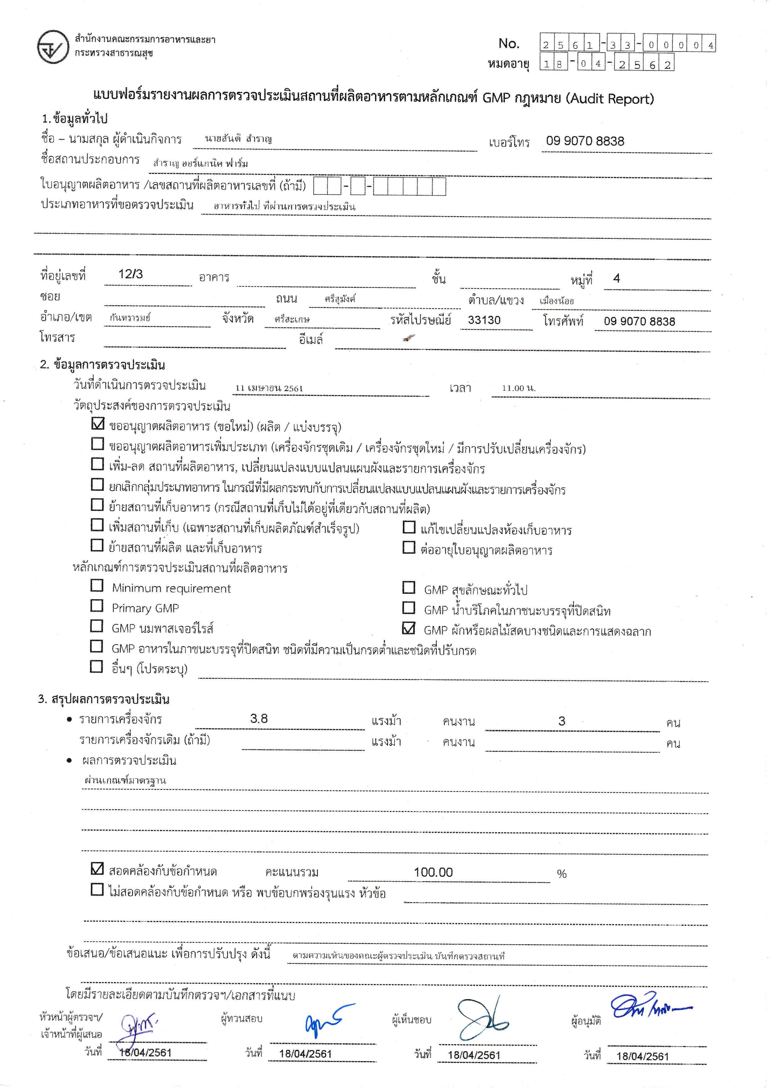 รับรองสถานที่ผลิตอาหารตามหลักเกณฑ์ GMP เลขที่ 33-2-00961